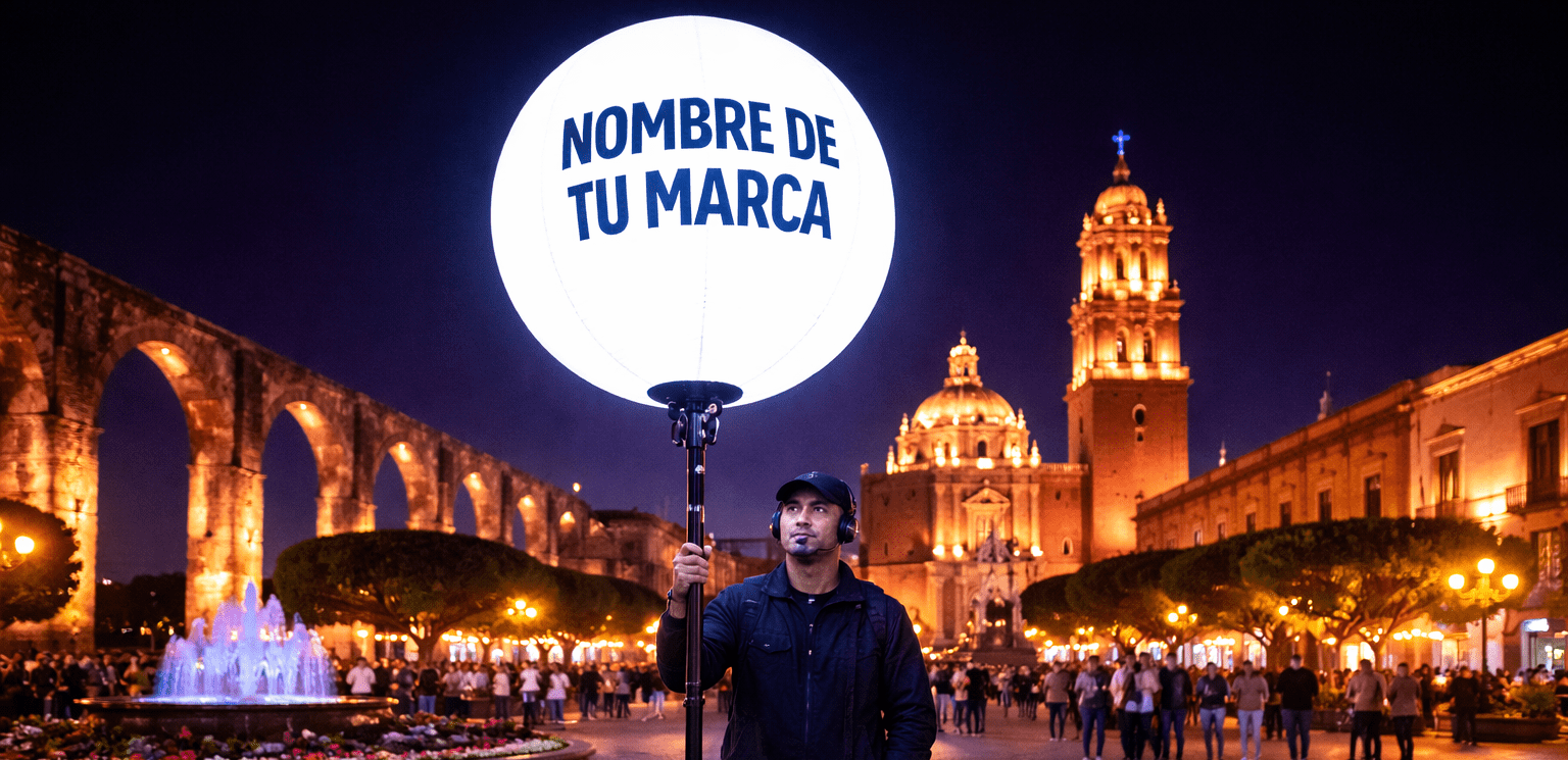 El operador , en caravana, camina en la acera y cruces de las avenidas más importantes, cargando a su espalda un globo iluminado con la imagen de la marca,